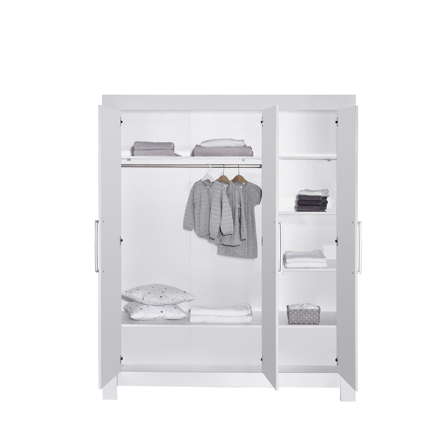 Nordic splende in bianco! Stile moderno con laccatura lucida. In bianco lucente. Dettagli del prodotto: Colore: bianco Materiale: legno truciolato Dimensioni: Ampiezza x Lunghezza x Altezza 158 x 53 x 189 cm 3 ante con chiusura soft-close 1 asta appendiabiti orizzontale 4 ripiani 2 lunghe mensole Attenzione: Le decorazioni NON sono incluse nella spedizione!