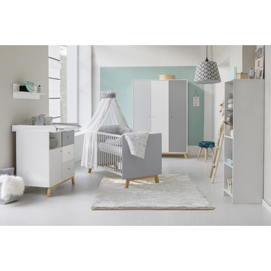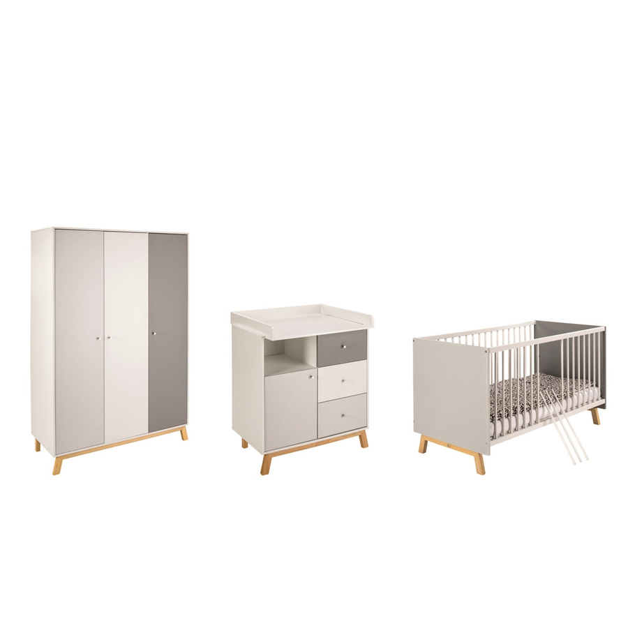 Dettagli del prodotto: Culla combinata Telaio a slitta regolabile in altezza 3 volte 3 pioli di scorrimento Lettino convertibile in Junior letto Comprese le pagine di conversione Cambio unità 3 cassetti aden a chiusura automatica con guide laterali extra forti 1 porta L'unità di cambio è rimovibile Armadio a 3 ante 3 porte con sistema di chiusura soft close 2 piani lunghi 4 fondi corti 1 appendiabiti Dettagli tecnici: Culla combinata Colore: grigio / bianco Materiale corpo: truciolato, rivestito in melamina Materiale sponda laterale: faggio massiccio, laccato Materiale telaio di base: faggio massiccio, oliato Superficie di sdraio: larghezza x lunghezza 70 x 140 cm Dimensioni: larghezza x lunghezza x altezza 77 x 144 x 84 cm Pagine di conversione Colore: bianco Materiale: truciolato, rivestito in melamina Dimensioni: larghezza x lunghezza x altezza 2 x 140 x 14 cm Comò Colore: bianco / grigio Materiale: truciolato, rivestito in melamina Materiale telaio di base: faggio massiccio, oliato Dimensioni senza cambiare unità: larghezza x profondità x altezza 90 x 53 x 94 cm Dimensioni con unità di cambio: larghezza x profondità x altezza 90 x 72 x 102 cm Cambio unità Colore: bianco Materiale: truciolato, rivestito in melamina Superficie di avvolgimento: larghezza x profondità 80 x 75 cm Altezza variabile: 94 cm Armadio a 3 ante Colore: bianco / grigio Materiale: truciolato, rivestito in melamina Materiale telaio di base: faggio massiccio, oliato Dimensioni: larghezza x profondità x altezza 135 x 53 x 194 cm Incluso nella consegna: Culla combinata Telaio a doghe Pagine di conversione Comò Cambio unità Armadio Attenzione: Materasso e decorazione non sono inclusi nella consegna