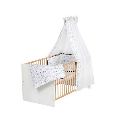 Lettino con letto extra morbido per dolci sogni d'infanzia. dettagli del prodotto: Culla combinata Colore: naturale / bianco Materiale barre e telaio a doghe: faggio massiccio, verniciato Materiale parte testa e piede: truciolato, rivestito in melamina Superficie di sdraio: larghezza x lunghezza 70 x 140 cm Dimensioni: larghezza x lunghezza x altezza 77 x 143 x 79 cm Regolabile in altezza 3 volte 3 pioli di scorrimento Trasformabile in Junior letto con kit di conversione Certificato TÜV: marchio GS del TÜV Turingia Made in Germany Schardt come vincitore del test impegno sostenibile Materasso Dimensioni: larghezza x lunghezza 70 x 140 cm Materiale: schiuma fredda Set letto a 4 pezzi Colore: bianco / nero Design Origami Dimensioni biancheria da letto: larghezza x lunghezza 40 x 60 cm / 100 x 135 cm Materiale biancheria da letto: 100% cotone Lavabile a 30 °C, adatto per l'asciugatura a tamburo Dimensioni nido: larghezza x lunghezza 30 x 160 cm Materiale nido: 100% cotone, imbottitura in pile 100% poliestere Dimensioni cielo: lunghezza 160 cm, circonferenza 250 cm Materiale cielo: 65% cotone, 35% poliestere Istruzioni per la cura: Biancheria da letto e baldacchino lavabile a 30 °C, adatto per l'asciugatura a tamburo Nidi lavabili a 30 °C su un ciclo di lavaggio delicato, non adatti all'asciugatura a tamburo Incluso nella consegna: Culla combinata Materasso Telaio a doghe Kit di conversione a Junior letto Barra a baldacchino di Metal l Set letto a 4 pezzi: biancheria da letto, nido e baldacchino Attenzione: Cuscino e piumino non sono inclusi