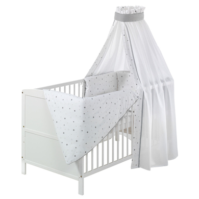 Il set è composto da: lettino combi (trasformabile in lettino junior), materasso, baldacchino e set biancheria per lettino 4 pezzi. La biancheria è lavabile a 30° C. Capi adatti all´asciugatrice. In cotone 100% Dettagli: •