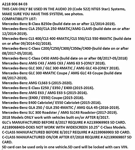 Scheda SD compatibile con i modelli Mercedes: CLS 400 / CLS 400 4MATIC / CLS 550 / CLS 550 4MATIC (data di costruzione dal 09/2014 al 02/2018). MERCEDES: Classe C C200 / C250 / C300 / C350e / C400 (data di costruzione dal 08/2017 al 05/2018). Mercedes: Classe C C450 AMG (data di costruzione dal 08/2017 al 05/2018). Mercedes: AMG C43 / AMG C63 / AMG 63 S (solo 2018). Mercedes: GLC 300 / GLC 300 4MATIC / AMG GLC 43 (data di costruzione dal 08/2017 al 07/2019).