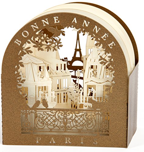Scheda Oblò "Tetti di Parigi + Torre Eiffel buona anno - 3d in taglio laser. Colore bronzo, interno blanc-doré. 9 cm di larghezza. Con Busta e fogli per scrivere. Sotto tasca plastica. Fabbricazione francese.