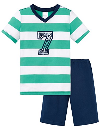Pigiama corto per ragazzi della serie SCHIESSER "Play it", maglietta con righe in verde e bianco e 7 in blu scuro sul petto, scollo a V e cuciture decorative sui lati e sulle spalle in blu scuro, piccola bandiera SCHIESSER sulla cucitura laterale, pantaloni da ciclismo blu scuro in morbido jersey di qualità.