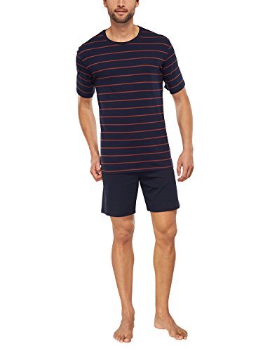 Questo pigiama corto da uomo promette una piacevole notte di sonno in 100% cotone fine. Un blu scuro carismatico, il discreto scollo a V e l'elegante tasca ricamata sul petto con apertura a contrasto sottolineano il look classico della parte superiore, che viene completato con i pantaloni corti, verde/blu. Un comodo duo di biancheria da notte nella migliore qualità Schiesser