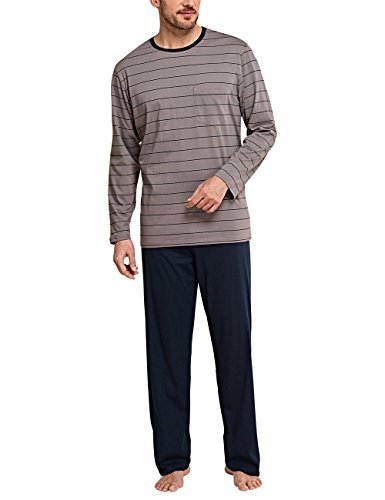 Comodo ed elegante allo stesso tempo, questo pigiama lungo convince gli uomini esigenti. Il fine jersey singolo in 100% cotone offre una piacevole sensazione di morbidezza sulla pelle e può convincere anche visivamente con sottili righe e la tasca sul petto sulla parte superiore color tortora e con i pantaloni lunghi blu scuro. Ideale per gli uomini che amano la biancheria da notte comoda della migliore qualità Schicher.