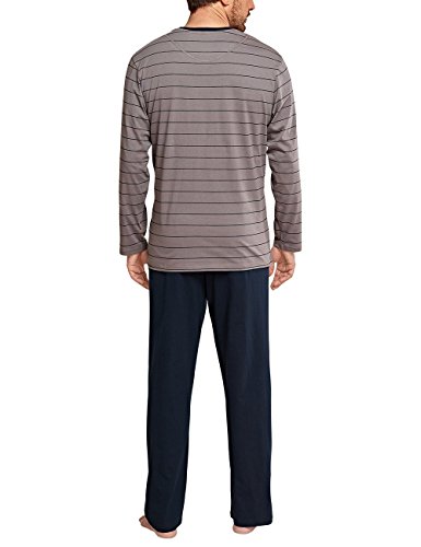 Pigiama lungo da uomo della serie SCHIESSER Mountain Lake color tortora con scollo rotondo, blu scuro, a maglia fine e taschino sul petto con stampa Pad-Print sul collo - senza fastidiose etichette interne, pantaloni lunghi blu scuro con comodo elastico in vita in morbido jersey di qualità