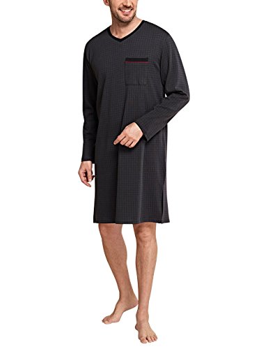 Camicia da notte da uomo a maniche lunghe, nera, della serie SchIesser "Scotland Yard" con motivo grafico allover grigio, scollo a V nero e tasca sul petto con pistoncini rossi. Etichetta delle taglie tramite stampa morbida sulla nuca. Senza fastidiosa etichetta interna, fessure laterali per il massimo comfort in morbida e di alta qualità. Disponibile anche in taglie forti