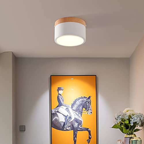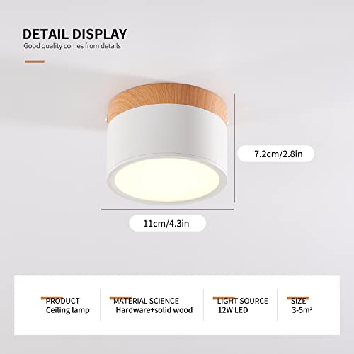 Schindora Apparecchio da soffitto a LED, faretto da superficie per decorazioni in legno, apparecchio per mini-soffitto, rotondo, bianco, bianco freddo 6000 K, 12 W.