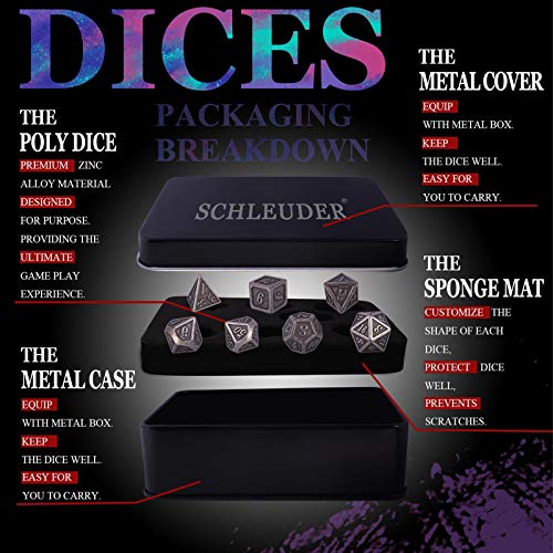 IL PRODOTTO INCLUDE: I set dadi d&d include D20, D12, 2 x D10 (00-90 e 0-9), D8, D6 e D4. Vengono forniti con una scatola per dadi metallo e il coperchio con un supporto può essere utilizzato come vassoio per dadi d&d metallo, rendendo più comodo provare al dadi da gioco Dungeons & Dragons.