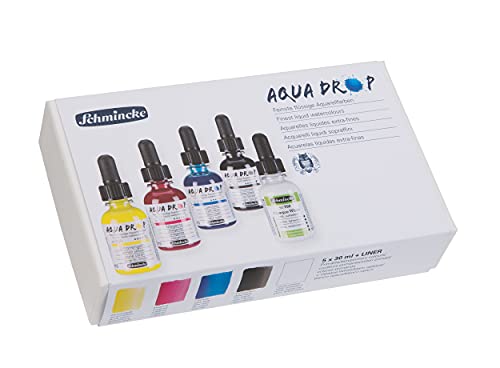 Schmincke- AQUA DROP acquarelli liquidi finissimi, 5 colori primari da 30 ml, in un set di cartone + bianco opaco, 78005097, set per pittura ad acquarello, calligrafia, handlettering, aeorografia