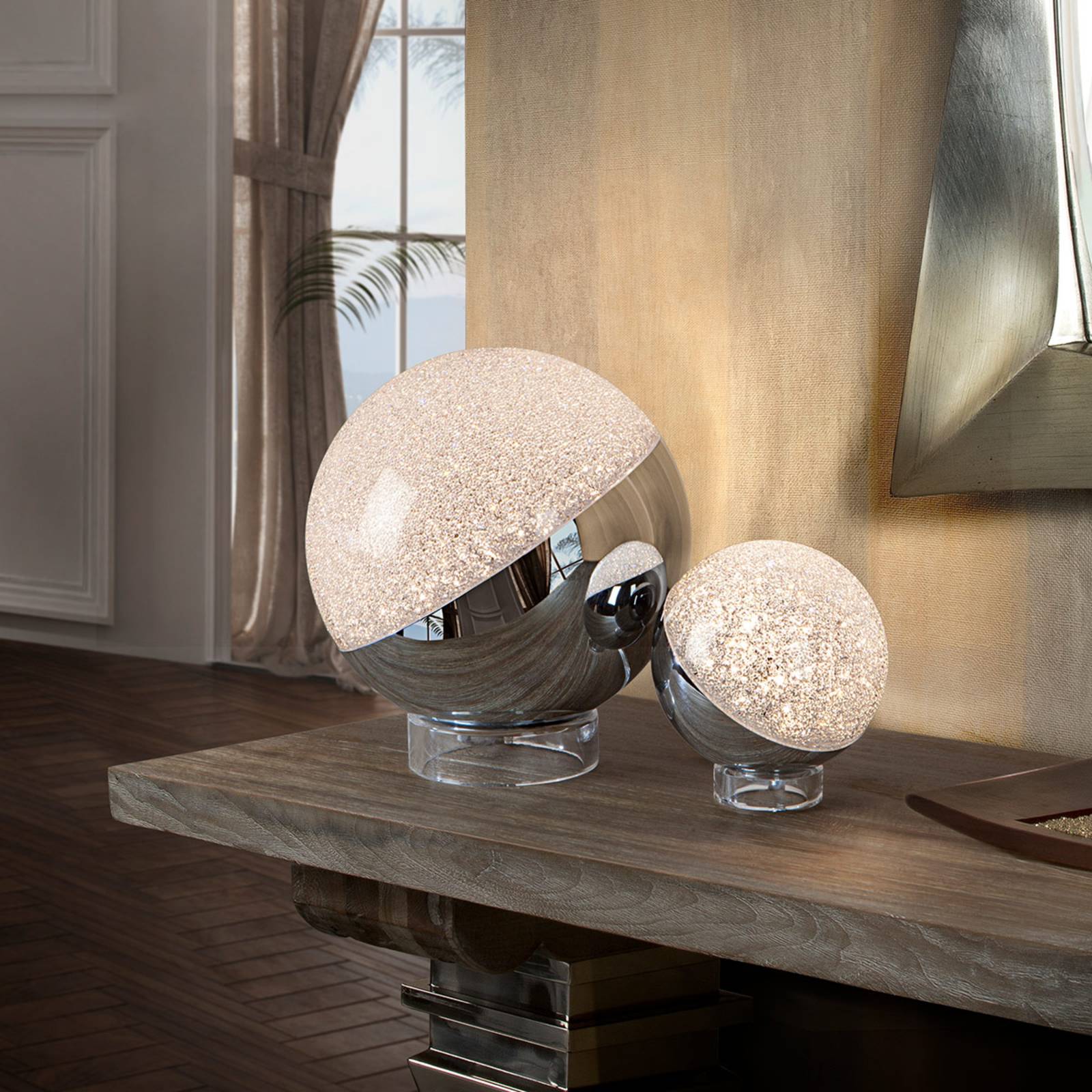 Sfera in due parti con effetto shimmer - Lampada da tavolo a LED Sphere La lampada da tavolo a LED Sphere colpisce per la sua sfera in due parti, per metà in policarbonato e per metà con una struttura interna, che offre grandi effetti di luce quando è accesa. L'altra metà è in metallo con finitura cromata e riflette l'ambiente circostante. Il mappamondo è sostenuto da un anello di metacrilato trasparente e trova una collocazione adeguata sia in salotto che in camera da letto. La luce bianca e calda dei LED all'interno della sfera si irradia in modo brillante e suggestivo in diagonale verso l'alto nella stanza attraverso la metà strutturata.