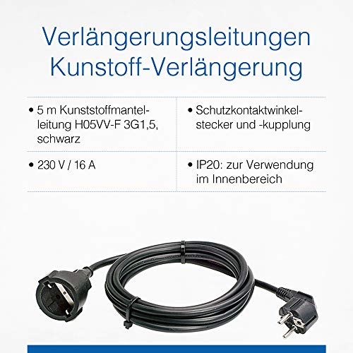 Cavo di prolunga: niente più cavi troppo corti. Il cavo rivestito in plastica da 5 metri H05VV-F 3G1,5 prolunga in modo sicuro e semplice qualsiasi cavo europeo.
