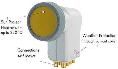 LNB in materiale plastico estremamente resistente al calore con cappuccio impermeabile per l'alimentazione, protezione aggiuntiva dei connettori F placcati in oro grazie alla copertura di protezione dalle intemperie estraibile