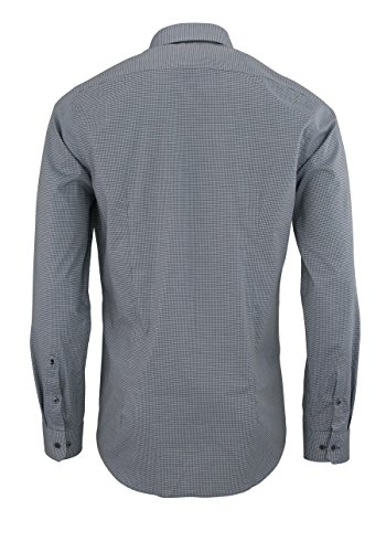 Moderna camicia business della collezione autunno/inverno 2015. La qualità non necessita di stiratura in 100% cotone con taglio sciancrato offre un comfort senza pari. Il modello è dotato di braccio extra lungo. La lunghezza dello scafo è stata regolata di conseguenza (per colletto 40: lunghezza delle maniche 71 cm, lunghezza del busto 83 cm). La camicia ha un piccolo colletto a squalo alla moda e una chiusura a tre bottoni non trapuntata. Il colletto interno e i polsini interni hanno un rivestimento in tessuto coordinato.