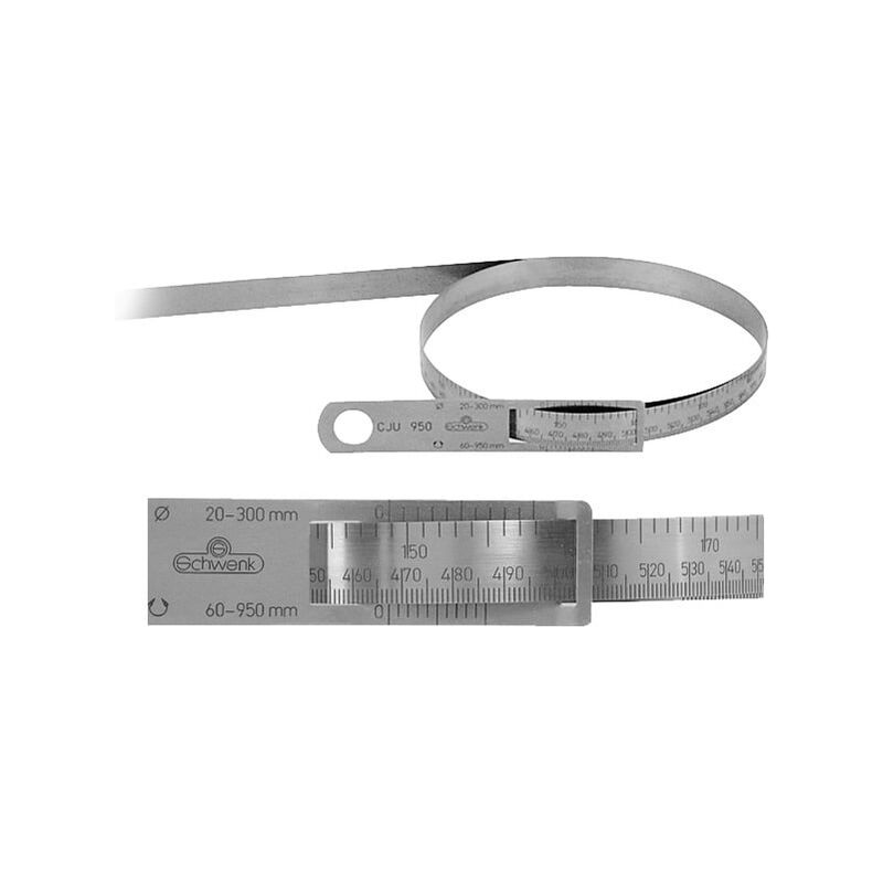 Nastro in acciaio CJU per misurare circonferenze e ⌀. Nastro in acciaio per molle con graduazione doppia incisa a laser sulla parte anteriore per la misura di circonferenze e ⌀. Distanza tacche 1 mm. Lettura nonio 0,1 mm. Limiti di errore della graduazione a norma DIN 866. Esecuzione V2A in acciaio per molle inossidabile. Nota: Metro a nastro C con lettura 0,05 mm e metri a nastro con rivestimento nero su richiesta. Esecuzione fissa CJU su richiesta. Dati tecnici Taratura G2 Tipo di prodotto Flessometro Risoluzione, mm 0,1 Spessore nastro, mm 0,2 Intervallo di misurazione per ⌀, mm 700 - 1.100 Intervallo di misurazione per circonferenza, mm 2.190 - 3.460 Larghezza del nastro, mm 16