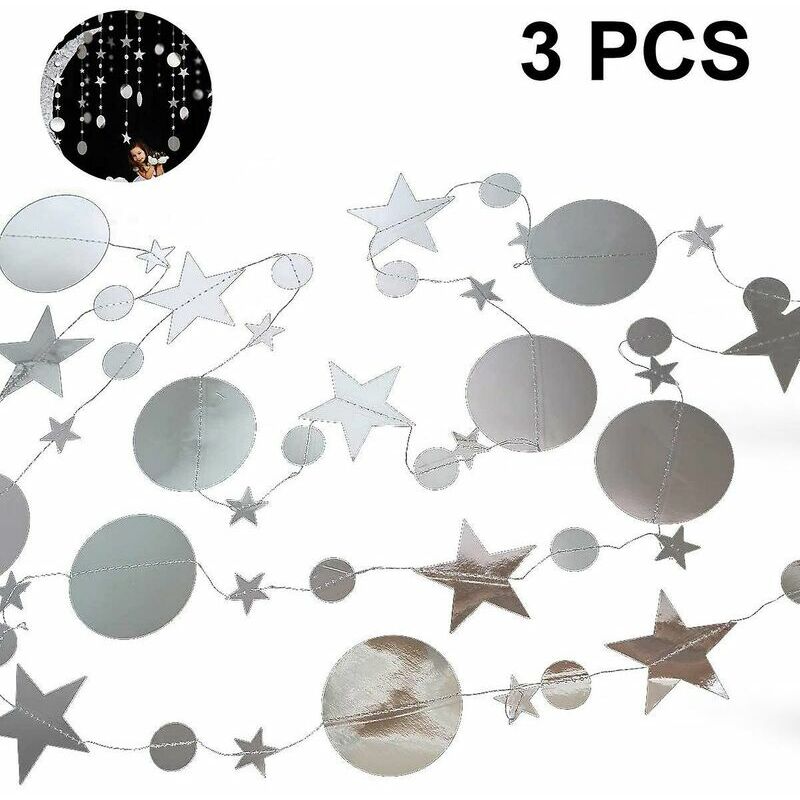 1.?IL PACCHETTO COMPRENDE ghirlande da 3 pezzi/4 metri, per un totale di 12 metri. 2. DESIGN UNICO: il design metallico opaco e unico rende questa ghirlanda così bella e unica. La bellissima combinazione di stelle e cerchi con lucentezza metallica, stella glitterata multiforme e ritagli circolari di diverse dimensioni, crea una festa completamente diversa per te. 3. FACILE DA ASSEMBLARE Stelle e cerchi sono cuciti con filo d'argento. Districare l'intera ciocca e appenderla delicatamente per evitare di attorcigliarla. E le ghirlande possono essere tagliate in diverse lunghezze. 4? AMPIAMENTE USATO? Appendi decorazioni affascinanti sul muro, sull'albero di Natale, sul tavolo, sullo scaffale, sulla finestra, sull'aula, sulla vetrina o sulla porta per aggiungere un tocco speciale. Appendere alla porta o al soffitto è anche un'ottima idea. Perfetta aggiunta alle decorazioni per le feste. Un modo economico ma ottimo per decorare la tua vita. 5. GARANZIA DI QUALITÀ Carta di carta di alta