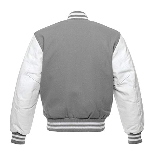 Sconosciuto Grey INT Varsity Jacket Men's Baseball Jacket Wool Body & Genuine Leather Sleeves Letterman Jacket (Grey/White)