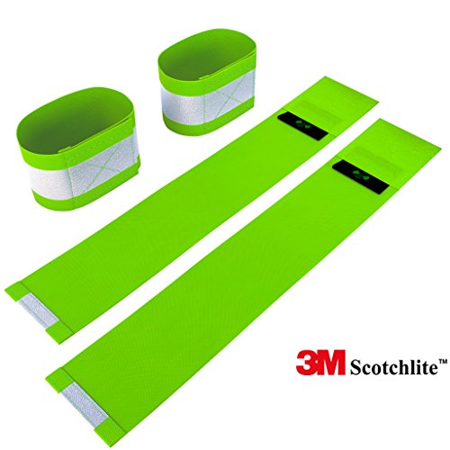 Materiale leggero - polsiere da zivalo composto da un materiale tessuto Neon verde di alta qualità con velcro e 3 m Scotchlite. Non avrete mai preoccuparvi di pile e ancora, come con un prodotto a LED. Le bande sono 25,4 cm di lunghezza e 4,1 cm di larghezza. Essi può essere allungato fino a 38,1 cm e può essere indossato anche come bande alla caviglia. L' argento striscia riflettente 3 m nel centro è 2 cm di larghezza.