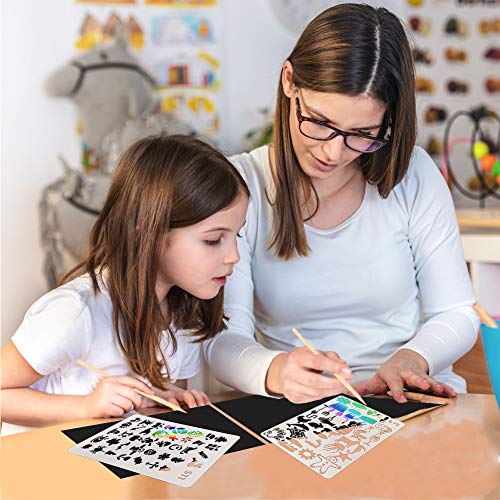 Scratch Art Bambini, 50 Pezzi 19 * 13 cm/7,4 * 5,1 in Black Disegni Scratch Paper Addensare Magic Color Scratch Art per Adulti Ragazzi, con 5 Ticks 2 Modelli di Disegno