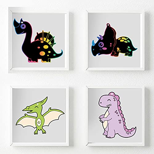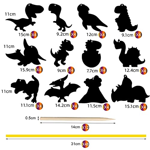 Scratch Art Bambini, 48 Pezzi Dinosauro Fogli di Disegni Scratch Art Fogli Neri da Grattare Bambini con 12 Pezzi Penne di bambù e 48 Pezzi Nastri, Dinosauri Decorazioni per Feste Compleanno Regalo