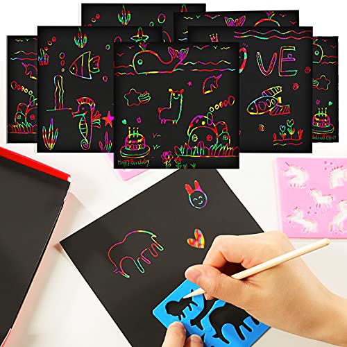 Scratch Art Notes per Bambini, MOOKLIN ROAM 106 Fogli di Disegni Scratch Art Include 4 Stencil 2 Penne in legno per Disegni, Giochi e Scrittura - Migliori Regali per I Bambini (15 x 15 cm, colorful)