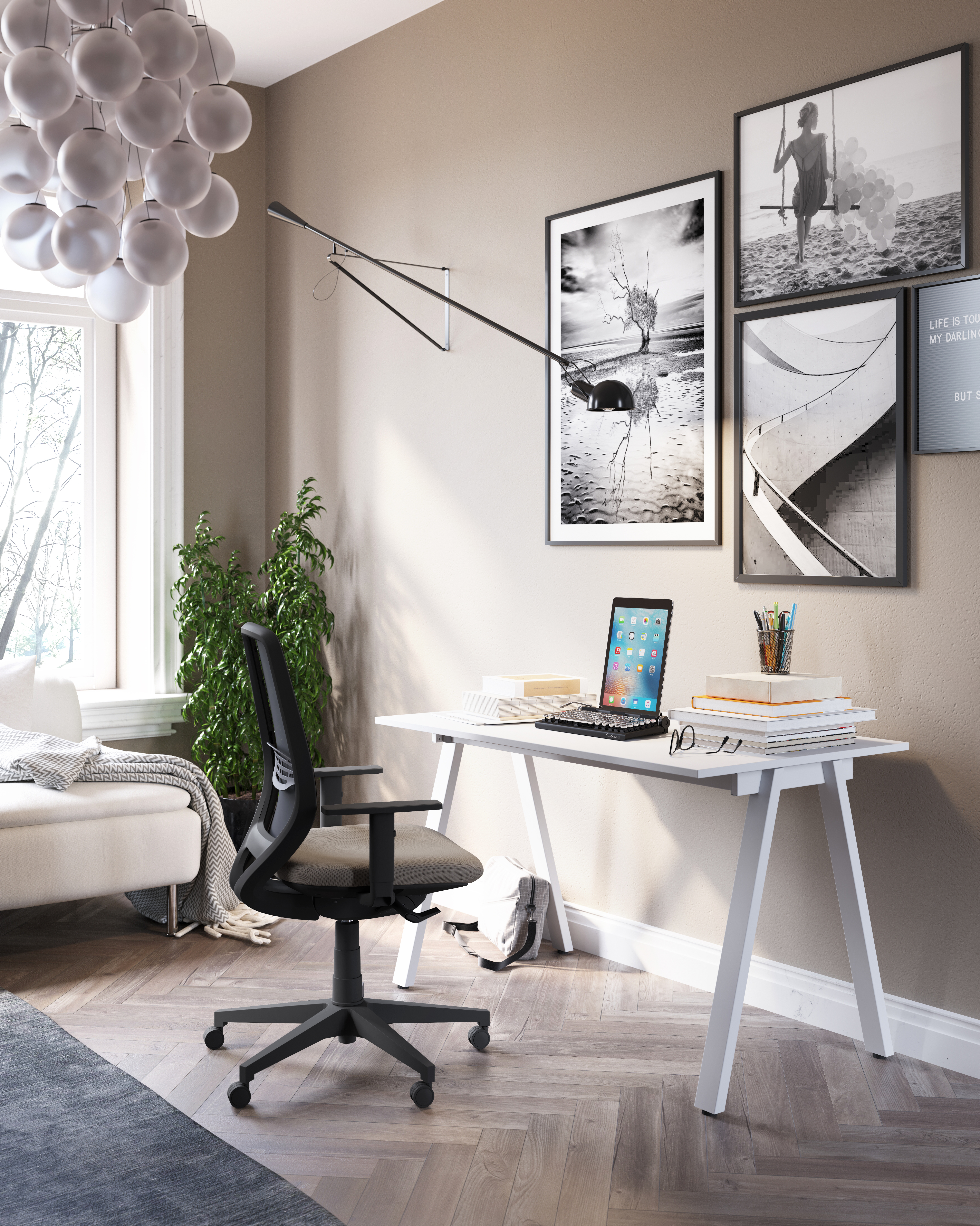 Piano realizzato con particelle di legno spessore 18 mm in melaminico in classe e1 basso contenuto di formaldeide bosrdato perimetralmente in abs spessore mm 2 in tinta con le superfici. basamento metallico e' costituito da 2 gambe a cavalletto e 2 travi logitudinali. colore bianco