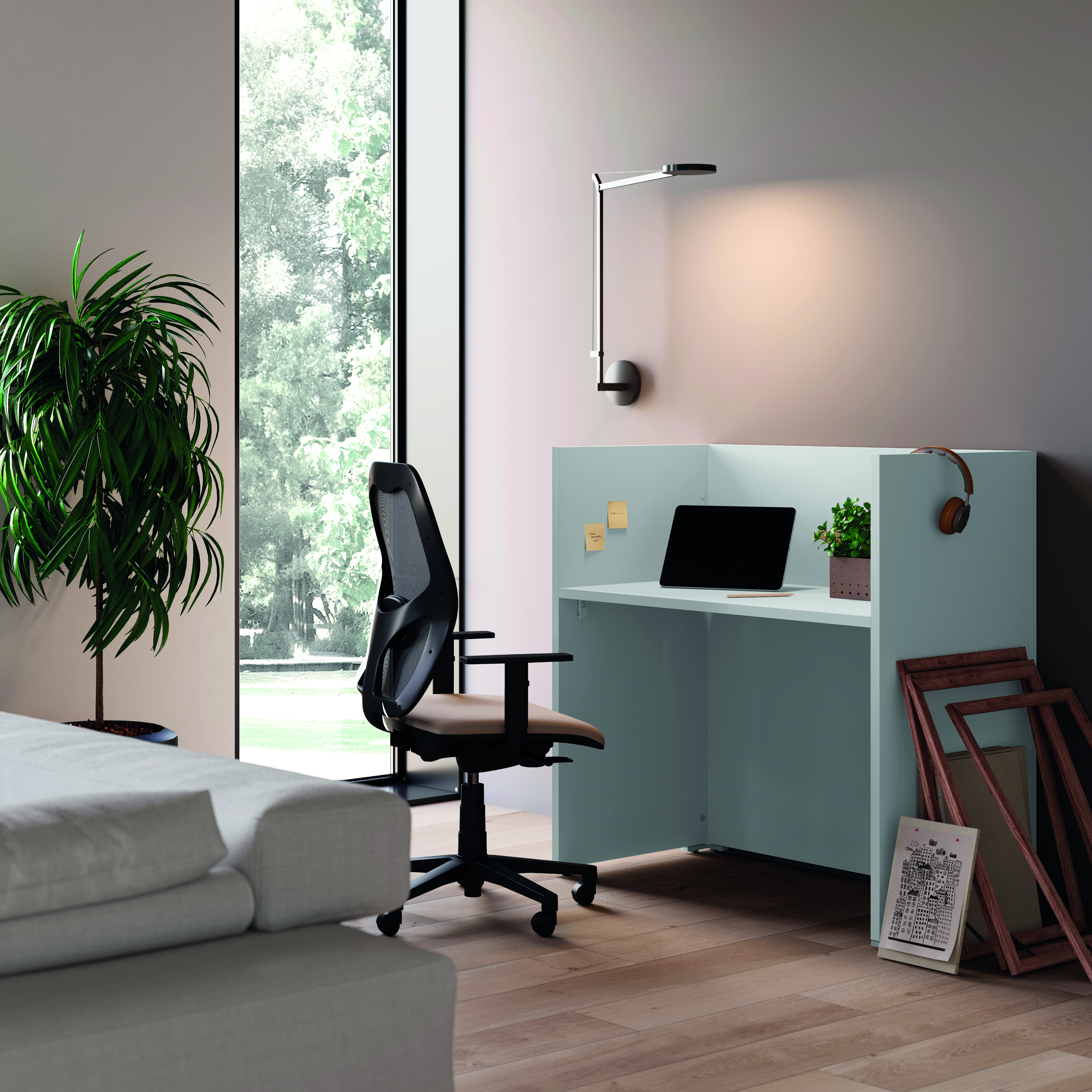 Piano realizzato con particelle di legno sp mm18 nobilitato melaminico in classe e1 basso contenuto di formaldeide bordato perimetralmente in abs mm2 in tinta con le superfici. il piano e' dotato di due spigoli interni smussati da 50 mm per permettere il pasagio dei cavi. le paretine di sostegno del piano sono dotate di piedini livellatori colore bianco