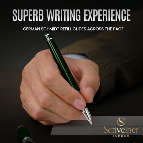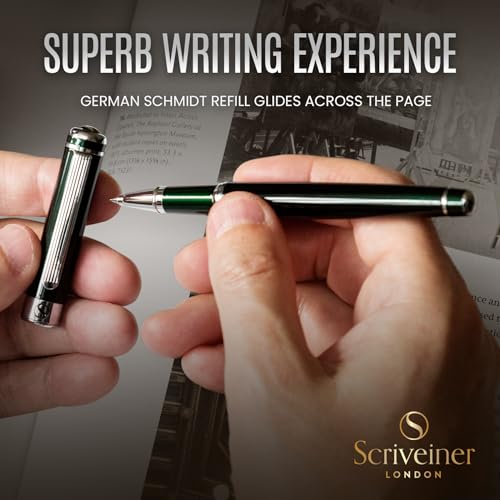 ★ GODI LA SENSAZIONE DI SCRIVERE CON UNA PENNA PROFESSIONALE - Splendida penna roller professionale di Scriveiner. Ottone laccato verde scuro con decori cromati. Qualità premium ed eleganza raffinata da una marca britannica da boutique.