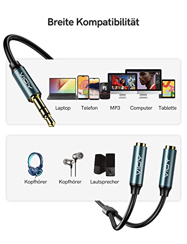 【1 a 2 da Sdoppiatore Jack 3,5 】: VIOY splitter audio pensato per separarsi in due uscite da una sorgente, che consente all'audio di smartphone, lettori MP3, lettori CD, laptop, tablet di trasferire a 2 dispositivi di uscita tra cui cuffie, altoparlanti, e altro ancora, è una buona scelta per condividere musica, film e giochi insieme durante il viaggio.