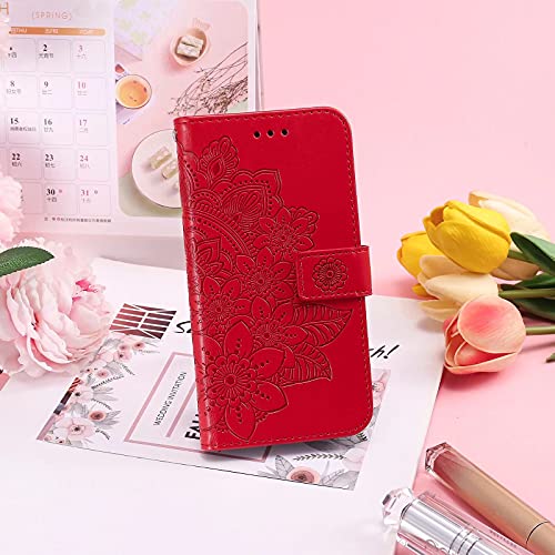 SEAHAI Pelle Cover per Oppo Find X5 Lite, Elegante Fiore a Sette Petali Design Flip Custodia in PU Portafoglio, Antiurto Case Cover con Funzione Stand/Slot per Schede, Rosso