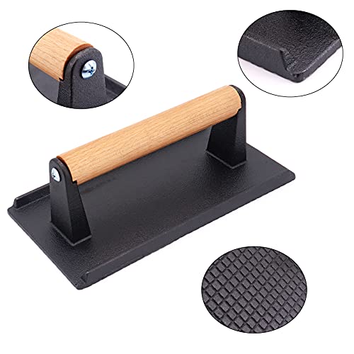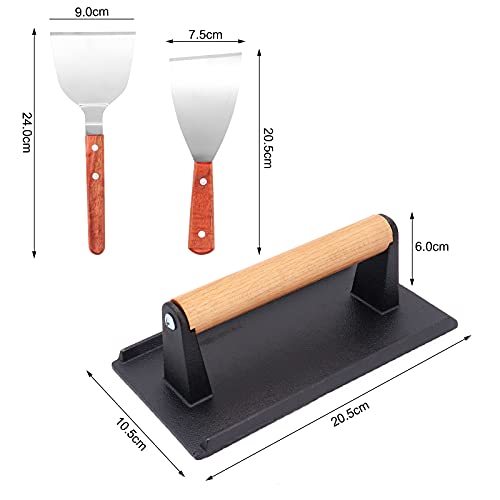 Seahelms - Pressa quadrata per pancetta in ghisa, 21 cm, con manico in legno, spatola per bistecca e spatola obliqua, ideale per pancetta, hamburger, sandwich alla griglia, uova e bistecca