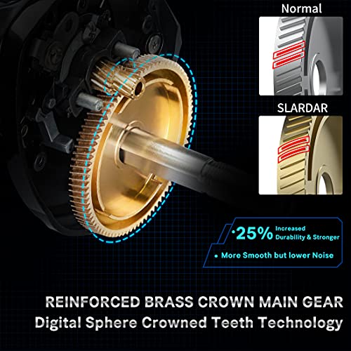 INGRANAGGIO PRINCIPALE IN OTTONE - Le bobine Slardar baitcasting sono dotate di ingranaggi in ottone a forma di tamburo lavorati digitali. Ogni dente sull'ingranaggio è a forma di arco, che è il 25% più rigido rispetto agli ingranaggi ordinari, migliora notevolmente la capacità portante della bobina baitcaster Slardar. Ridurre l'usura interna, ridurre il rumore e renderlo più liscio, che è favorevole alla lunga distanza baitcasting.