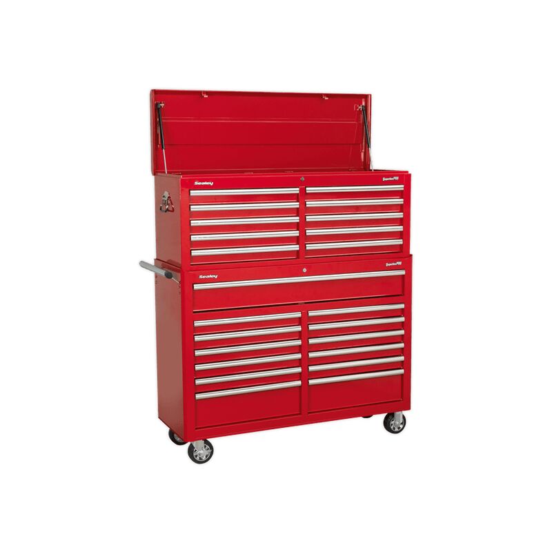 Cassettiera portautensili extra-larga progettata per accogliere gli attrezzi, anche usando i nostri vassoi portautensili modulari. Coperchio superiore ammortizzato a gas per apertura e chiusura fluide. Struttura in acciaio verniciato di grande spessore, verniciata a polvere, per resistere a ruggine e solventi, per una maggiore resistenza e durata. I cassetti, specifici per impieghi pesanti,sono dotati di guide con cuscinetti a sfera da 45 mm Meccanismo di bloccaggio posteriore a tutta altezza, che blocca i cassetti a tutta lunghezza in più posizioni. Serratura di sicurezza a cilindro, fornita con due chiavi Ogni cassetto è dotato di eleganti maniglie in alluminio e fodere antiscivolo. Dotata di quattro ruote in lega PU/PP da Ø125 mm per impieghi gravosi, due ruote con punta larga e due ruote fisse. La confezione include: AP5210T - Top da 10 cassetti con guide con cuscinetti a sfera - rosso AP5213T - Carrello da 13 cassetti con guide con cuscinetti a sfera - rosso Dimensioni