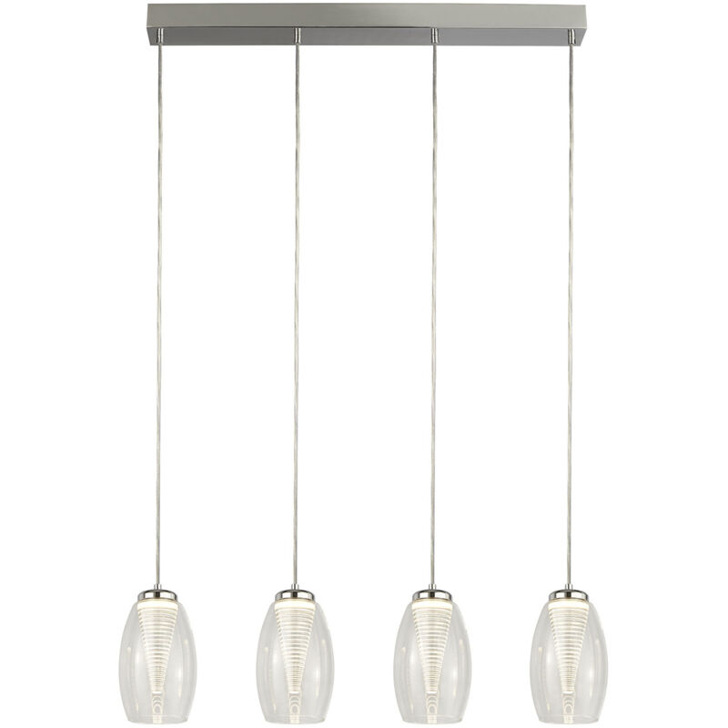 Searchlight Cyclone Sospensione a 4 luci a barra, vetro trasparente 3000K | Finitura: Cromata, Trasparente | Materiale: acciaio dolce, vetro, acrilico | Grado di protezione IP: IP20 | Altezza massima: 150 cm | Lunghezza: 75,5 cm | Larghezza: 11,5 cm | Tipo di lampada: LED integrato | N. di lampade: 4 | Dimmerabile: Sì | Kelvin: 3000K (bianco caldo) | Lumen: 1573Lm | Peso: 3 kg | Potenza (max): 22 W