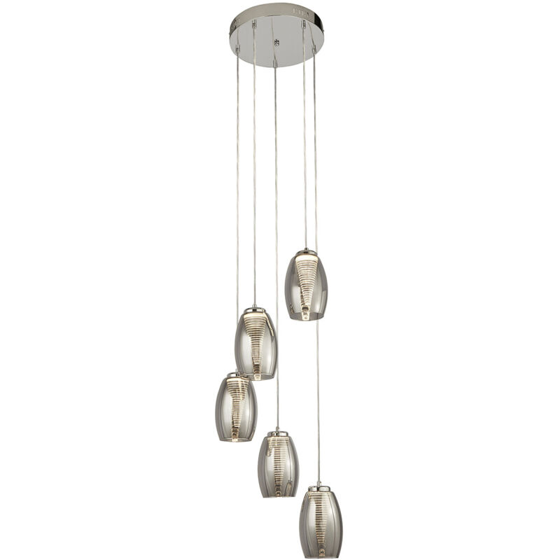 Searchlight Cyclone Sospensione a Goccia 5 Luci, Vetro Fumé 3000K | Finitura: Cromo, Fumè | Materiale: acciaio dolce, vetro, acrilico | Grado di protezione IP: IP20 | Altezza massima: 150 cm | Lunghezza: 35 cm | Larghezza: 35 cm | Diametro: 11,5 cm | Tipo di lampada: LED integrato | N. di lampade: 5 | Dimmerabile: Sì | Kelvin: 3000K (bianco caldo) | Lumen: 821Lm | Peso: 3,3 kg | Potenza (max): 27 W