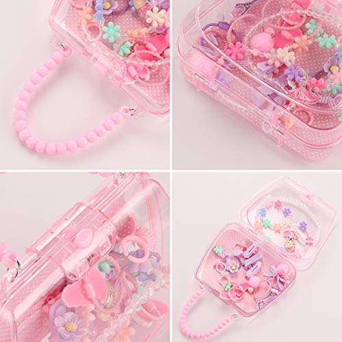 ✿18Pezzi Kit di gioielli carini per bambine ✿ - Incluso 1 x borsetta in plastica rosa, 2 x orecchini a clip, 4 x clip di capelli carini, 6 x Fascia per Capelli, 4 x Anello fiore, 1 x Collana di fiori e 1 x Braccialetto a fiori.