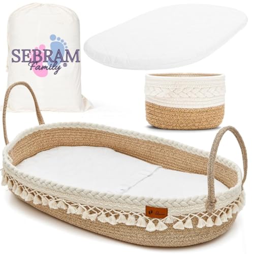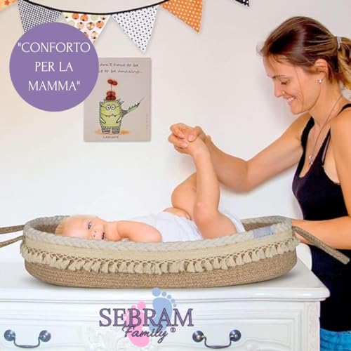 SEBRAM cestino fasciatoio neonato avorio con cuscinetto + cestino portaoggetti + materassino fasciatoio + copertina idrorepellente + borsa da viaggio neonato