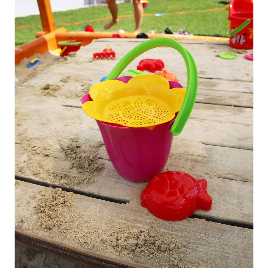 Dettagli del prodotto: Età: da 12 mesi Con il set di secchielli per fiori - 6 pezzi, nulla si oppone a una grande giornata di gioco nella scatola di Sand ! È composto da un secchio per fiori con setaccio coordinato, una pala, un rastrello e due stampi Sand . I bambini possono usare questo set per spalare, rastrellare e setacciare Sand o costruire castelli Sand I due stampi possono essere utilizzati per modellare un sole e uno scarabeo con Sand C'è anche un timbro nascosto sul lato inferiore del secchio, che può essere usato per creare un grande disegno floreale in Sand I robusti componenti del set sono realizzati con materiali di alta qualità e possono essere facilmente puliti dopo l'uso in spiaggia. Dimensioni e peso: Dimensioni da assemblato (lunghezza x larghezza x altezza): 21 x 21 x 21 cm Peso: 0,38 kg Materiale e cura: Materiale: HDPE Cura: lavabile