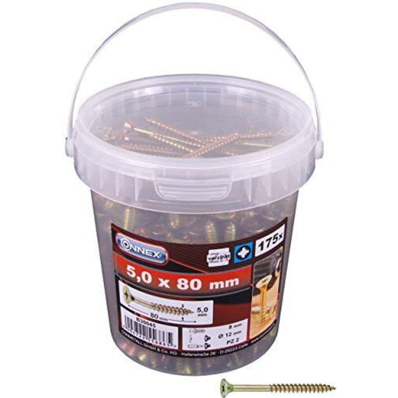 Set in secchiello di viti universali TPS a testa piana svasata, ideale per scomparire a filo del legno una volta avvitate. Misura 5,0 x 80 mm, impronta Pozidriv. Con superficie zincata gialla, anti corrosione. In confezione da 175 pezzi.