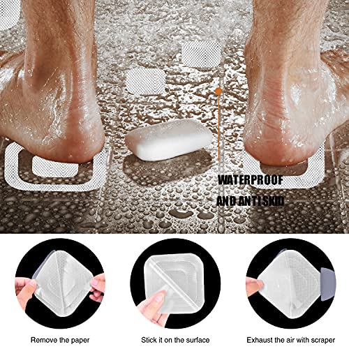 La confezione comprende 72 adesivi blu (24 pezzi per 3 dimensioni) e 1 raschietto in silicone di alta qualità. Il prodotto comprende 72 pezzi, di cui 3 forme/dimensioni: un piccolo quadrato compatto, un grande quadrato e un quadrato più piccolo con il centro aperto.. I 24 adesivi dovranno occupare almeno 2/3 della superficie per ridurre efficacemente il rischio di scivolamenti accidentali. Puoi usare questi adesivi anche sulle scale per renderle molto più sicure.