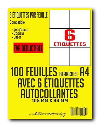 100 fogli A4 di 6 etichette orizzontali adesive equivalenti a 600 etichette autoadesive bianche, 105 x 99 mm. I nostri prezzi sono TTC e l'IVA è deducibile in fattura.
