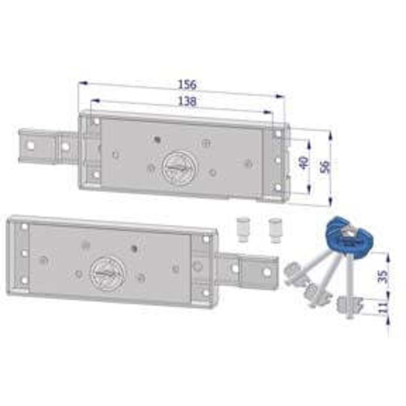 Scatola in acciaio zincato - serratura per serrande con chiave a doppia mappa - guidachiave componibile altezza mm.8 - 2 mandate - rinforzo al catenaccio - catenaccio movimentato da chiave