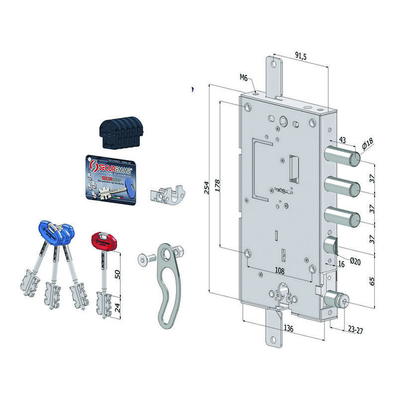 Scatola in acciaio zincato mm.136x254 - serratura superiore a doppia mappa, 4 mandate, corsa mm.40, scrocco reversibile e chiusura triplice - serratura inferiore a cilindro europeo che aziona sulla prima mandata il limitatore d'apertura regolabile con 2 mandate, corsa mm.20 e scrocco - serrature indipendenti - catenacci in acciaio cromato - fissaggio cilindro con attacco securemme - versione con blocco aste - catenaccio movimentato dalla chiave - sporgenza pistoni mm.3 - serratura reversibile - a serratura chiusa la maniglia non sgancia lo scrocco - possibilità di fissaggio rosetta maniglia con viti passanti interasse mm.38- duplicazione chiave protetta SECURMAP24 - in dotazione: 1 chiave di servizio e 3 chiavi