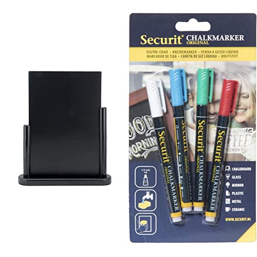 Securit Lavagna da tavolo Elegant Modello A4 Nero & Set da 4 pennarelli a gesso liquido colori di base Punta fine 1-2mm