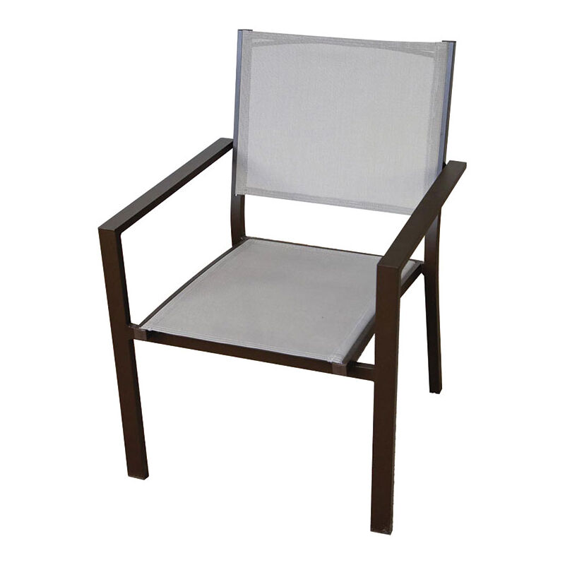 Struttura in alluminio marrone cioccolato. Poltrona in alluminio con schienale in tessuto. 55x61xh.85 cm.