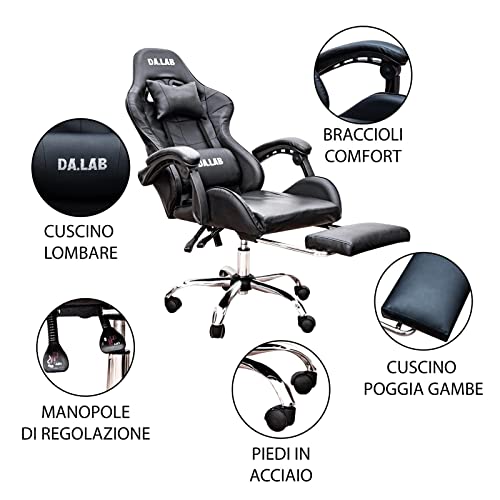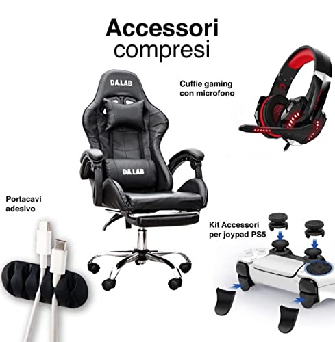 DA. LAB Sedia da Gioco Ergonomica - Sedia Gaming da Scrivania con Supporto Lombare, Poggiatesta, Poggia Gambe, Braccioli - Ruote in Acciaio, Seduta Regolabile - Accessori da Gioco, Cuffie, Porta Cavi