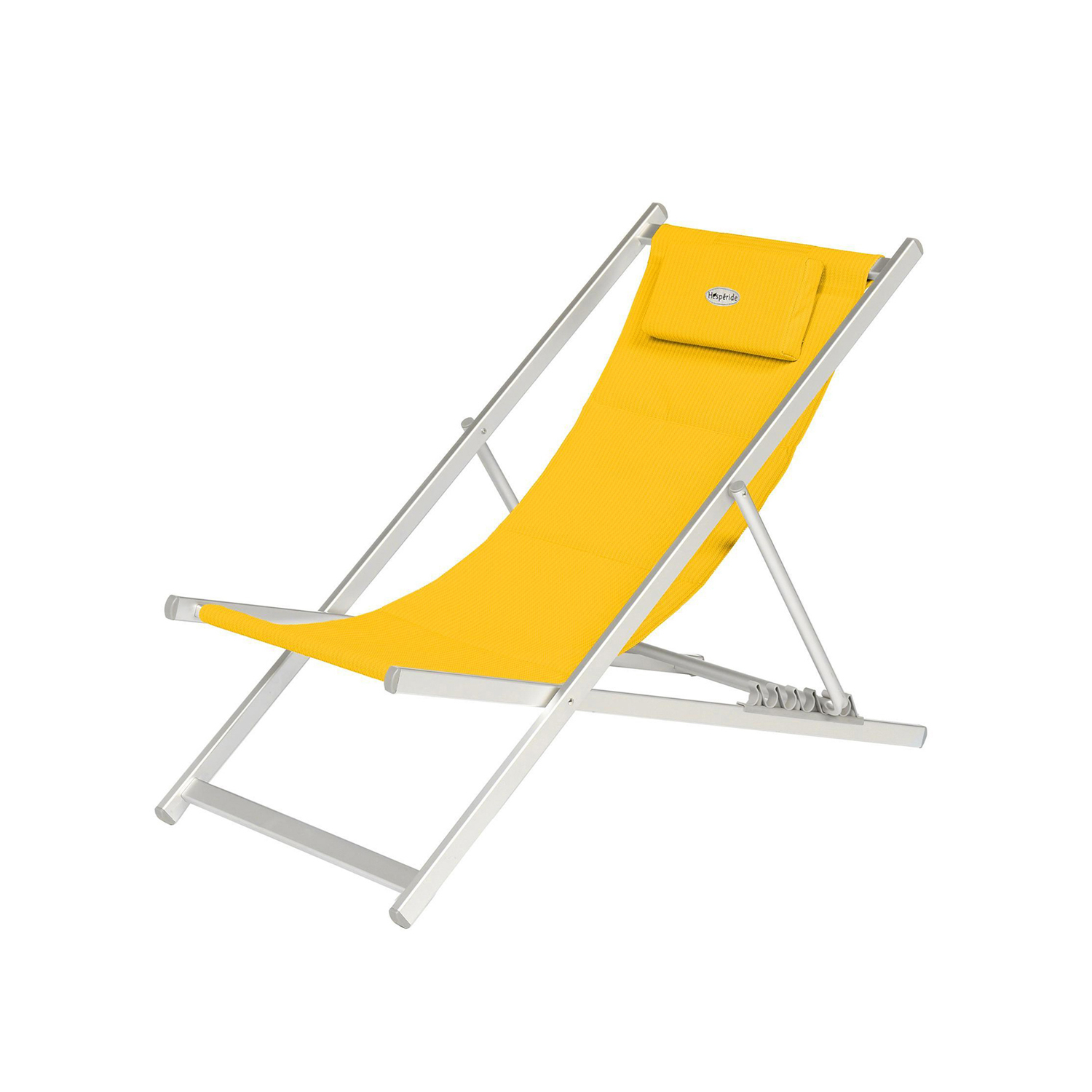 Goditi al meglio le ore di sole durante la primavera e l'estate, sdraiandoti sulla comoda sedia reclinabile della linea Honolulu. La robusta struttura in alluminio la rende durevole e resistente alle intemperie e alla ruggine e il rivestimento in textilene trapuntato è resistente agli strappi e non teme l'esposizione prolungata agli agenti atmosferici. Per il tuo comfort potrai utilizzare il poggiatesta imbottito e regolare lo schienale scegliendo tra le 4 posizioni disponibili. Perfetta per l'uso in giardino, sul terrazzo o a bordo piscina, si ripiega facilmente occupando il minimo spazio. Dimensioni prodotto aperto: 55x99x109 cm. Altezza seduta: 41 cm. Dimensioni chiusa: 55,5x7x128 cm. Portata massima: 110 kg. Pulire con un panno umido. Colore seduta: giallo.