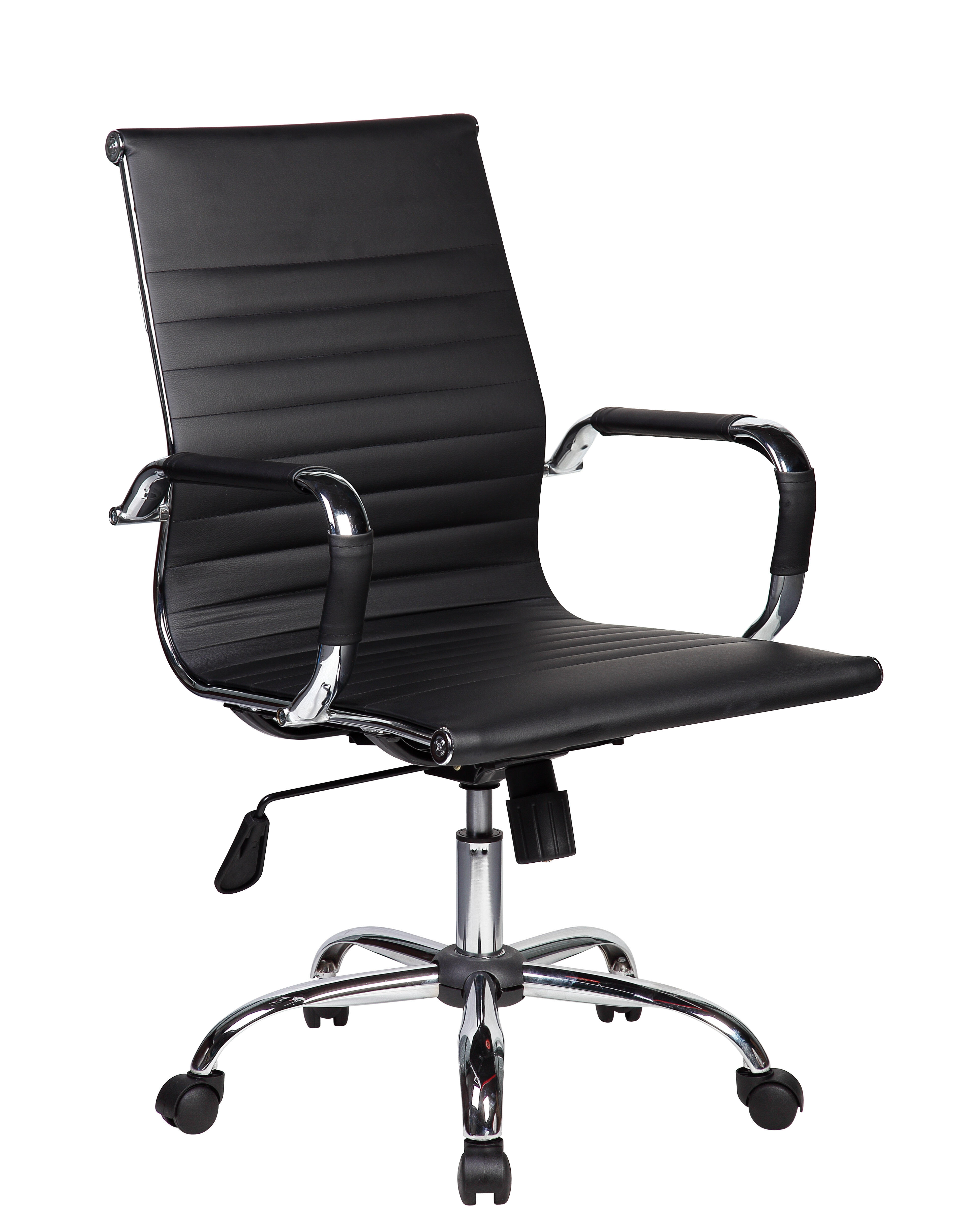 Poltrona Direzionale, Rivestimento in poliuretano, con ruote piroettanti certificate BIFMA (USA). La struttura e braccioli in acciaio cromato. Con sistema di elevazione a gas con la regolazione del sedile in altezza, scorrimento cm. 10. Meccanismo oscilante bloccabile. Regolazione di tensione della spinta. Pistone classe 3 certificato SGS. Dimensioni cm 54 x 62 x H 92/102.