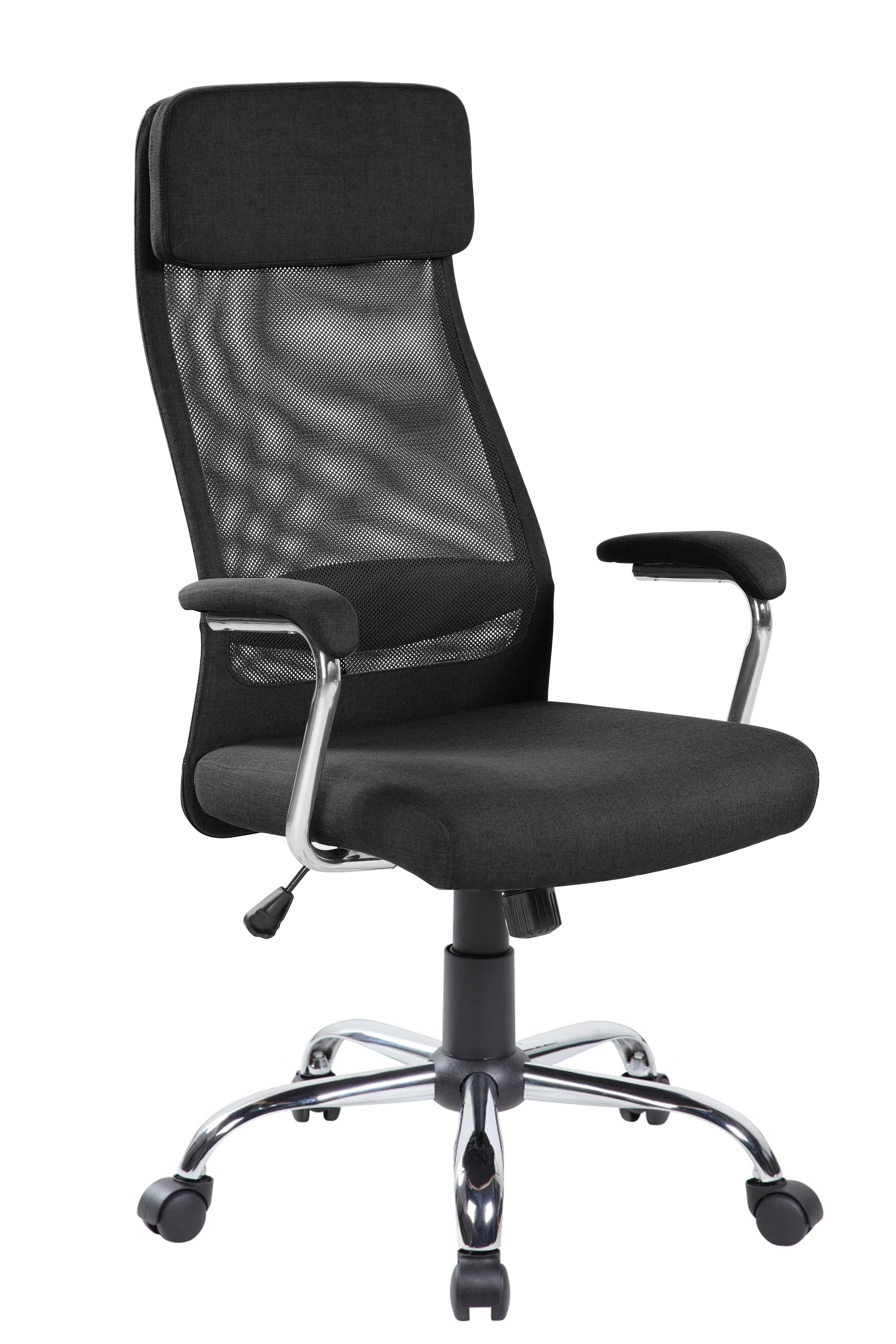 Poltrona Direzionale, Rivestimento in tessuto e rete tecnica traspirante, con Ruotepiroettanti certificate BIFMA (USA). La struttura e braccioli in acciaio cromato. Sistema di elevazione a gas per la regolazione del sedile in altezza, scorrimento cm. 10. Meccanismo oscillante bloccabile. Regolazione di tensione della spinta. Pistone classe 3 certificato SGS. Dimensioni cm. 65 x 62 x H 116/126