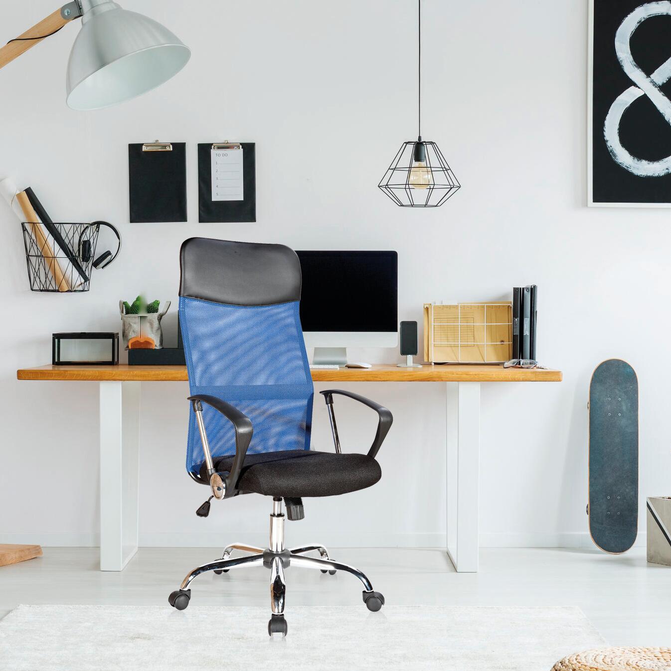 • Durante lo smartworking o il lavoro in ufficio è necessario avere una sedia ergonomica. La poltrona ufficio è adatta per le tue ore di lavoro intenso. Ha lo schienale sagomato che sostiene la zona lombare riducendo il rischio di dolori articolari e muscolari. Il poggiatesta è realizzato in morbido pu. Lo schienale e la seduta sono rivestiti in tessuto traforato perfetto per lasciare traspirare la schiena ed evitare l'accumulo di sudore. E' una sedia con ruote che ti permette di ruotare a 360° e spostarti senza doverti alzare. Ha una leva con cui puoi regolare l'altezza della seduta in base alle tue necessità. Inoltre lo schienale può essere reso flessibile e dondolare grazie al pomello rotante posto al di sotto della seduta. E' adatta sia come poltrona presidenziale in ufficio, sia come sedia per lavoro da casa. Disponibile in diversi colori. • Misure sedia seduta abbassata: H 113 cm x L 57,5 cm x P 58,5 cm - Misure sedia seduta alzata: H 123 cm x L 57,5 cm x P 58,5 cm - Larghezza seduta: L 48,5 cm - Altezza min/max seduta: 48/58 cm - Altezza schienale: 68 cm - Misure braccioli seduta abbassata: H 66 cm - Misure braccioli seduta alzata: H 76 cm cm - Carico max: 120 Kg • Colore: Nero, Blu • Montaggio: La sedia ti arriverà smontata. Istruzioni e kit di montaggio inclusi. Adatto per smartworking. Adatto per ufficio. Altezza regolabile. Schienale traforato traspirante. Ruote girevoli